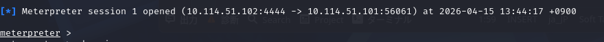 Kali LinuxのMeterpreterにもリバースシェルの通知が来る。